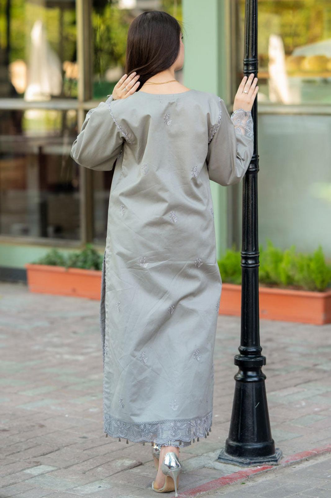 Premium Dhanak Embroidered Shirt (elegant ash grey base with lilac & lavender floral thread embroidery)