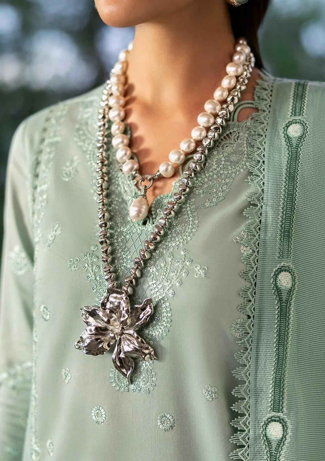 A serene pastel pistachio outfit, delicately crafted with intricate tone-on-tone embroidery and fine detailing. The shirt features subtle threadwork along the front, sleeves, and hemline, finished with scalloped lace for a graceful charm.