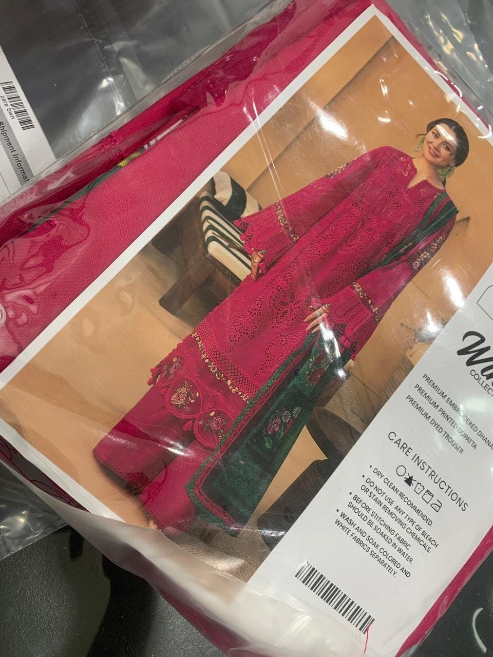 A vibrant fuchsia ensemble with delicate thread embroidery and intricate cutwork, paired with a deep green printed shawl for a striking seasonal look.